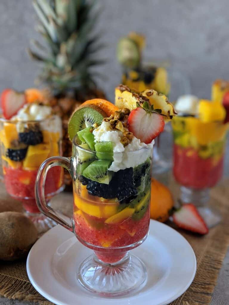 Lebanese Fruit Cocktails is a delicious fruit recipe is layers of fresh fruit and fruit puree or sorbet topped with ashta cream, shopped pistachios or almonds, and honey