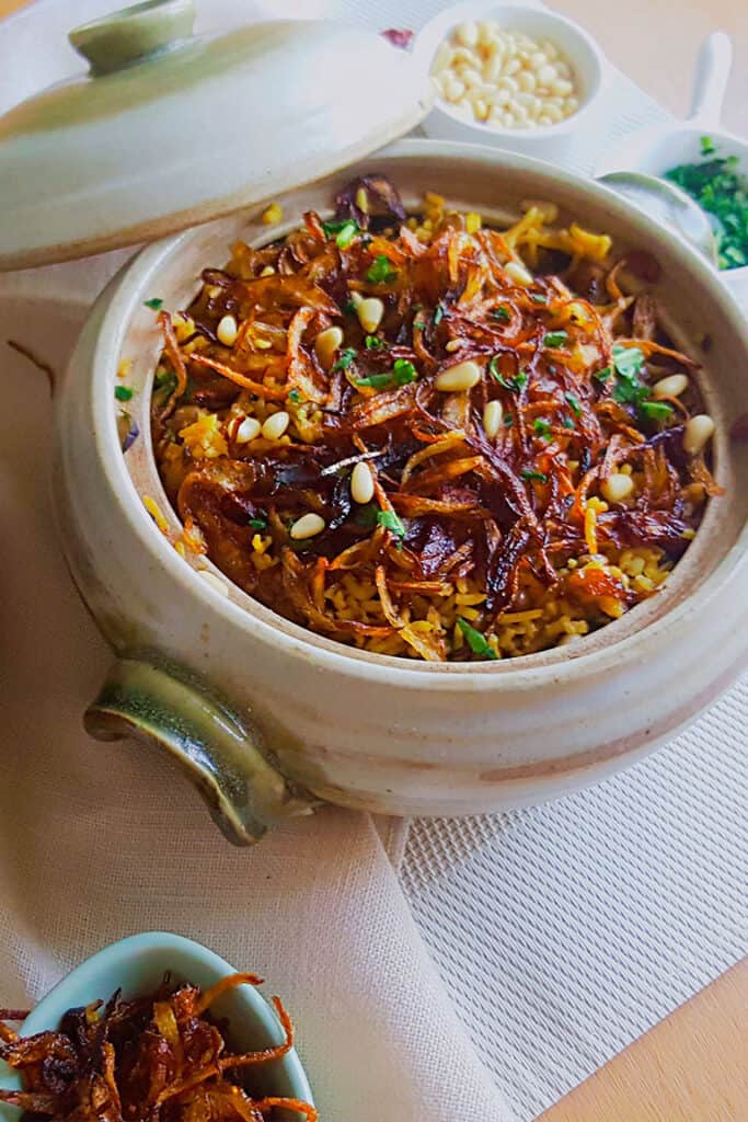 Mujadara is a simple Lebanese Middle Eastern dish of rice and lentils garnished with crispy caramelized onions. It is a budget-friendly, nutritious, and gluten-free vegan recipe