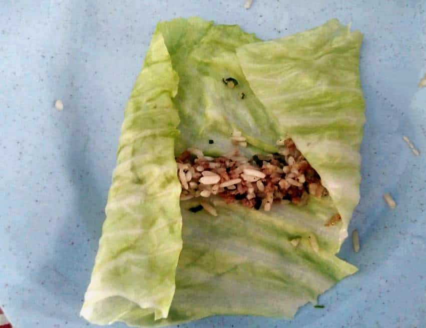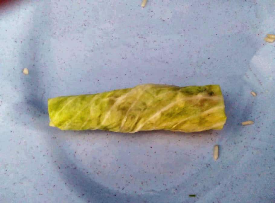 Firstly, I added the rice filling to the center of the cabbage leaves. Fold on both sides before you roll into a cigar shape. Repeat the process and place it all on the plate.