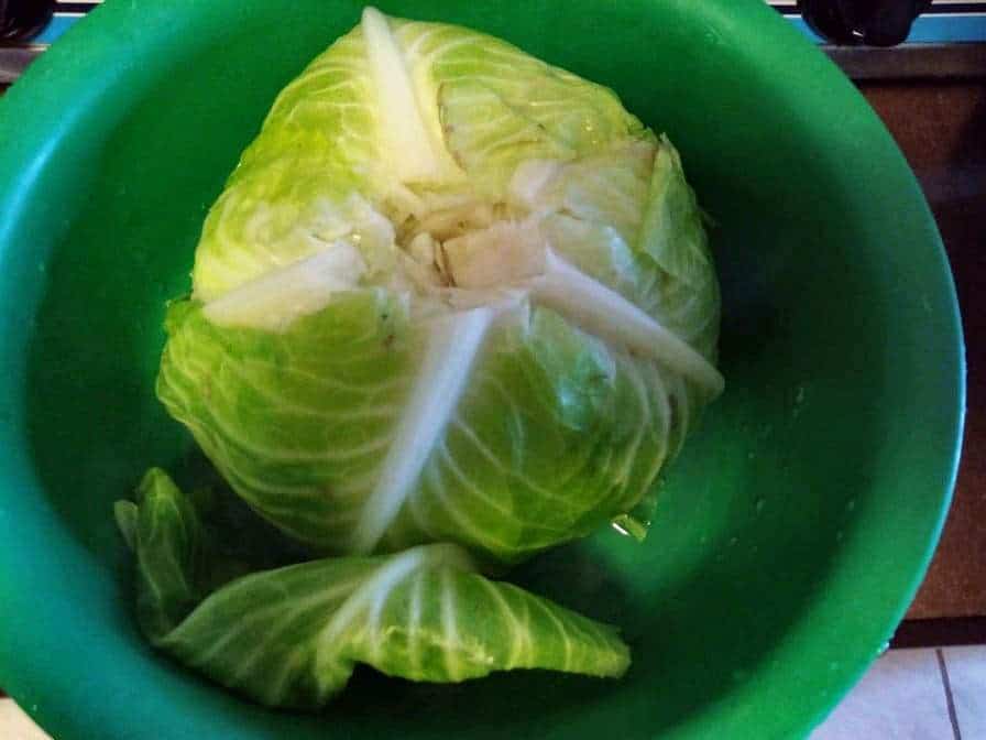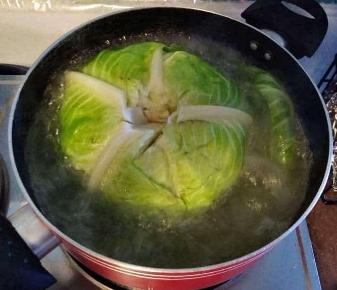 Once you cut it off, put it in the water in the pot and let it simmer for 5 to 10 minutes till it becomes soft (not too soft). I use the colander to drain the water and separate the cabbage.