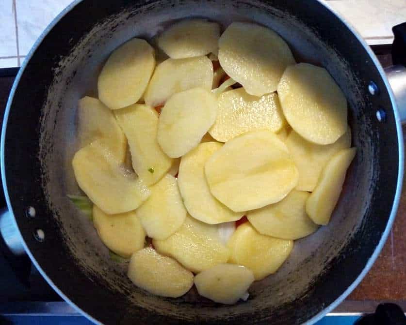 In a large cooking pot, I am making a layer here. First, I add the sliced tomatoes and leftover cabbages. And then followed by potatoes and chicken drumstick as a second layer.