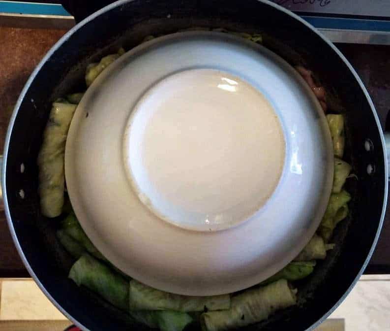 - Add a heat-proof plate in the pot and pushed it down using your hand. This will help hold the malfouf together while cooking.