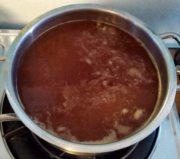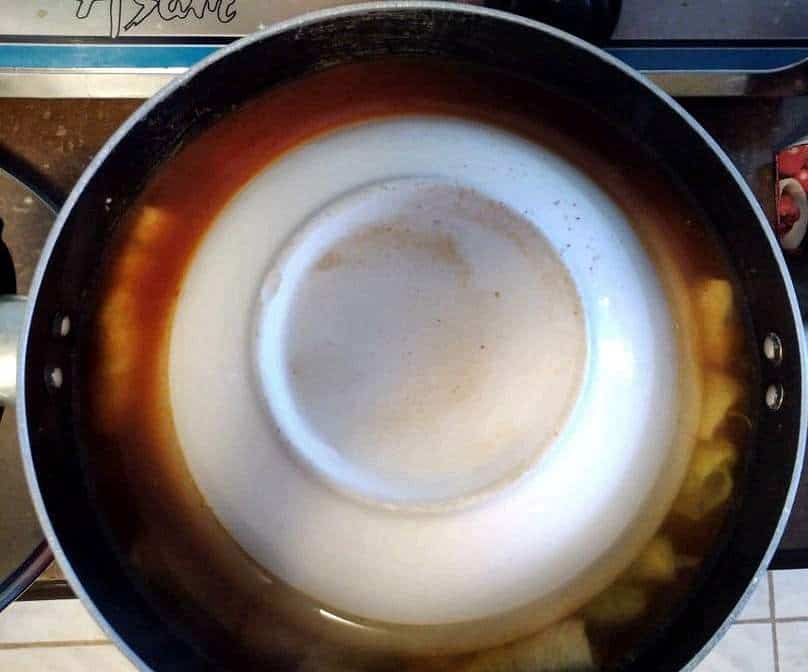 - Pour the Tomato Broth in the pot. Make sure the broth is above the edge of the plate.