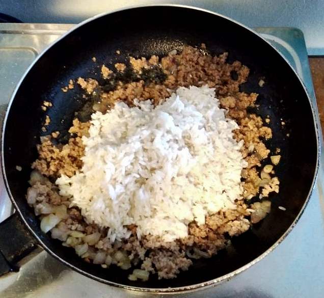 Firstly, I add olive oil to the pan in medium-low heat. Once the oil is hot, I added chopped red onion followed by ground beef, and then the uncooked rice. Stir for few minutes.