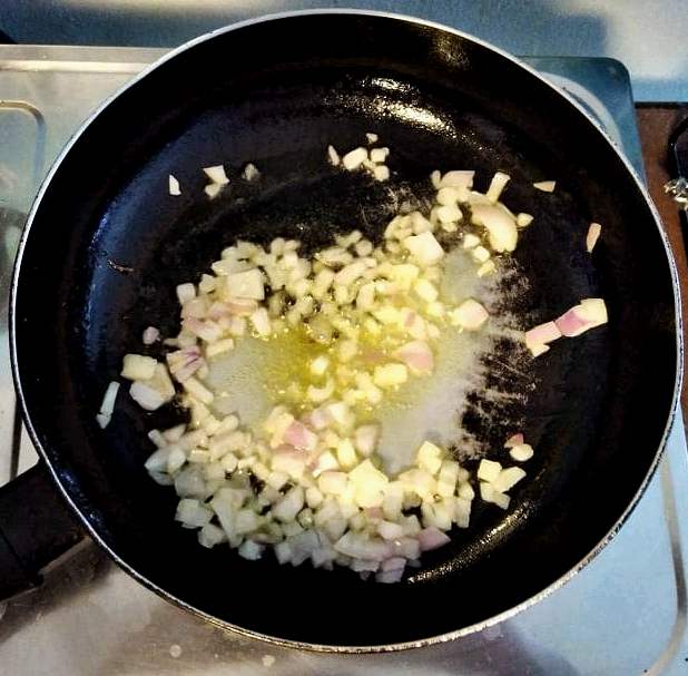 - Once the oil is hot, add chopped red onion. Stir till it turns translucent