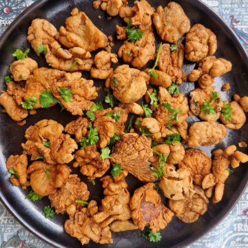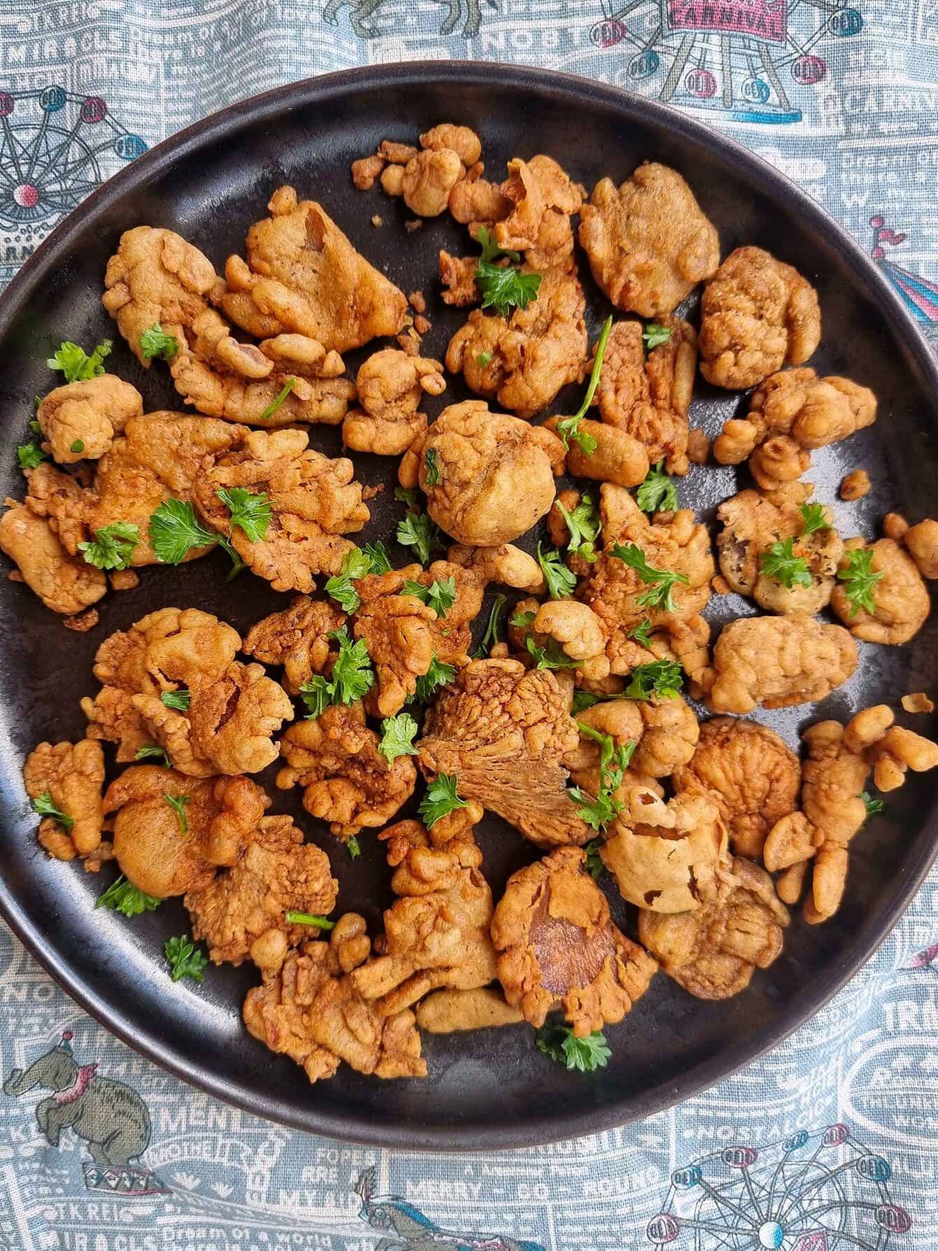 - Transfer the cooked mushrooms to a plate lined with a paper towel to remove excess oil. Serve with a spiced vinegar dip and steamed white rice. Enjoy!