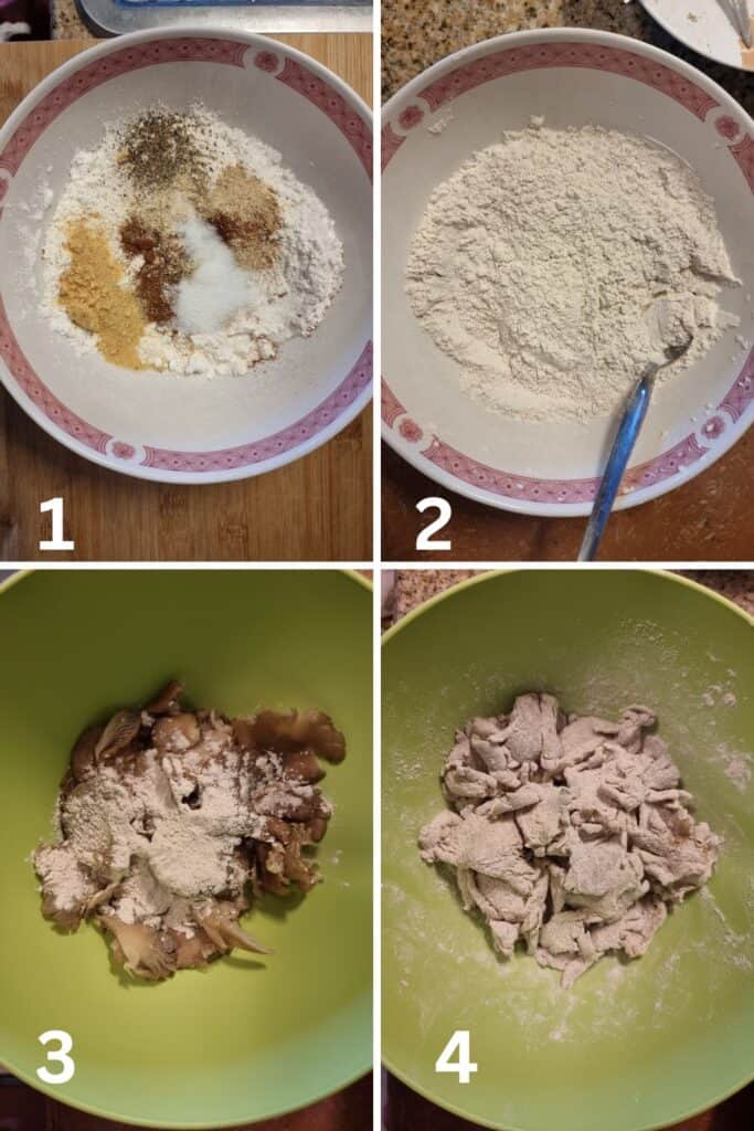 - Step 3 and 4- After that, I transferred the seasoned flour mixture into the mushroom which I then gently coated together. Set it aside.