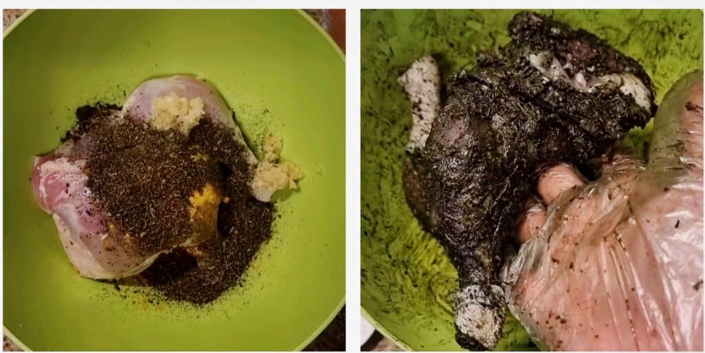- To start the marination, I combined the chicken with charred coconut powder, salt, black pepper, turmeric, grated garlic & ginger.
