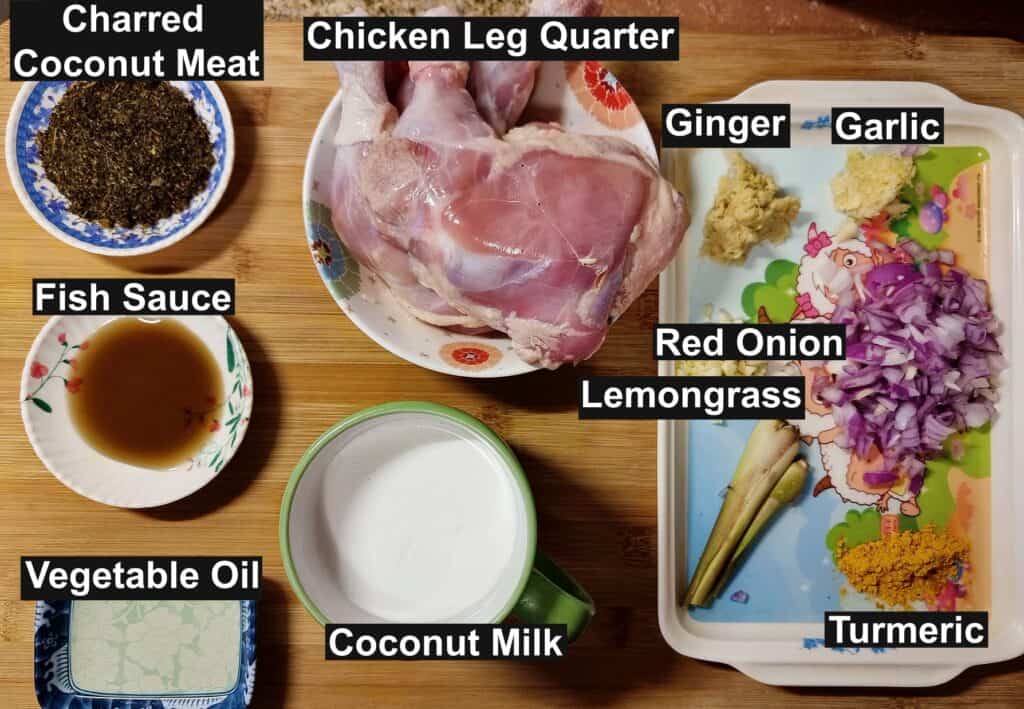 - Charred coconut meat: This is made from a white-fleshed coconut that is cooked over fire until it becomes light brown before being transferred into a food processor to make into a powder. This is the main key ingredient for this recipe since it gives a smoky flavor.