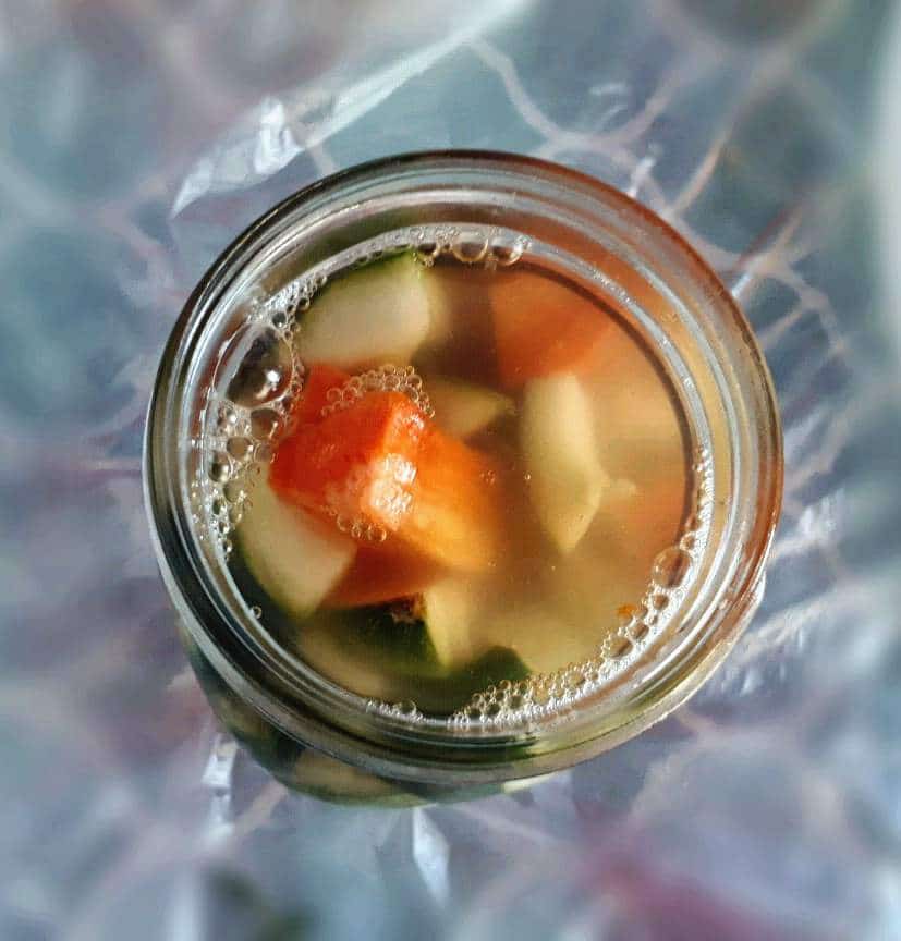 To make this recipe is easy and straight forward. First of all, you have to heat the water and vinegar. After that, you add salt and sugar and mix it well. Once it is fully dissolved, turn off the heat and let it cool down before putting it into the jar.