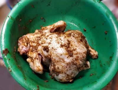 - Lemon- This will help moisten the chicken and gives a nice flavor. You can put it inside the cavity or outside.
