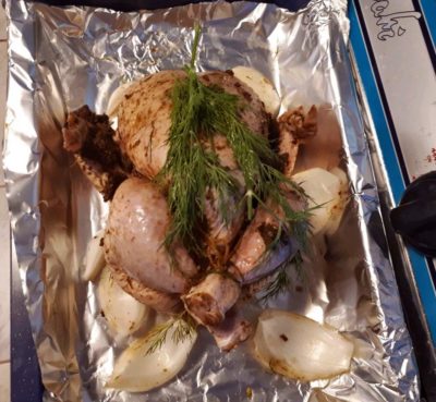 Put an aluminum foil into the baking pan. Drizzle the olive oil into the foil before putting the chicken. The olive oil will help prevent sticking the chicken after it is roasted. Put the chopped onion around the chicken into the pan. You can also put the dill herbs above the chicken. Put lemongrass, onion, and slice of lemon inside the cavity of the chicken. Drizzle the chicken with salt before transferring into the oven. Baked for 180 C for 60 minutes. After it is done, baked for another 30 minutes using 200 C.