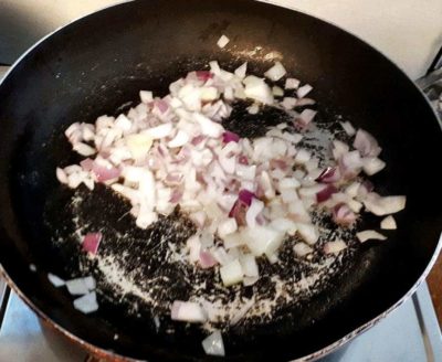 - Add 2 tablespoon of olive oil in the pan in medium heat. Once it is hot, add onion and stir it for a minute or until it is light brown.