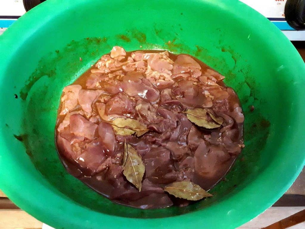 I clean the liver with water first. After that, I marinated them with lemon or lime juice. The lemon contain a citric acid that can help remove the smell of the liver or other meats. This is also perfect if you will like to remove fishy smell from your seafood.