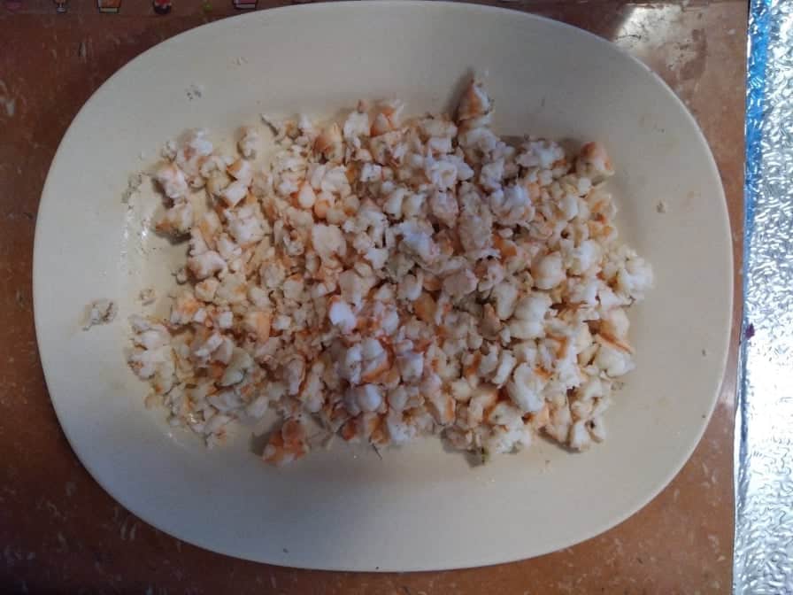 Before you start cooking this dish, you must cook the shrimp ahead. Once done cooking, you cool it down and then chopped into smaller pieces.