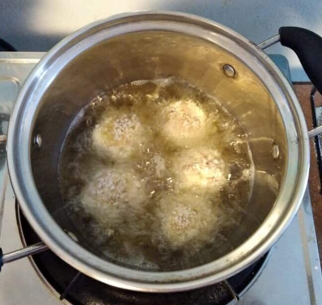 In a bowl, I pour vegetable oil and when it turns hot, that is when I added the shrimp croquettes. Let it deep fry on both sides till it turns golden brown.