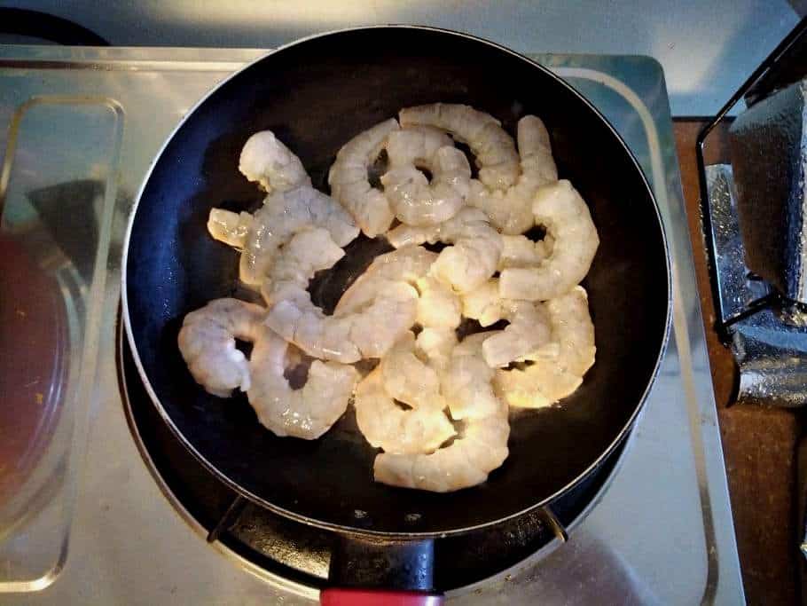- Once it becomes hot, add the peeled shrimp. Stir till it turns pink which indicate it is already cooked