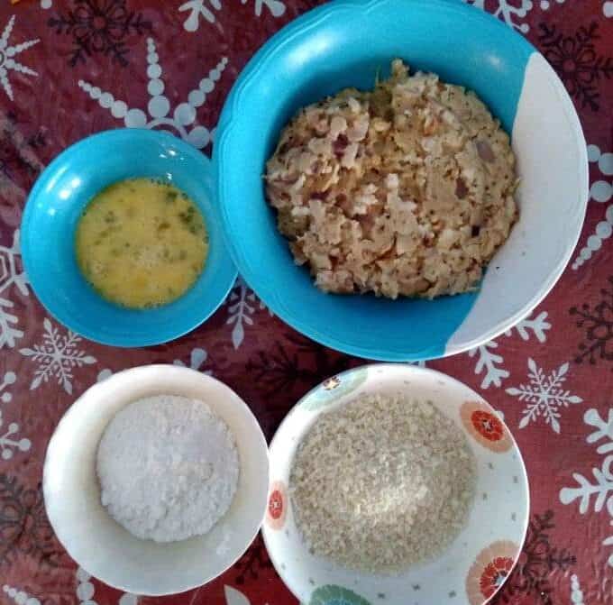 - Remove the shrimp mixture, and prepare a separate bowl of flour, egg, and breadcrumbs.