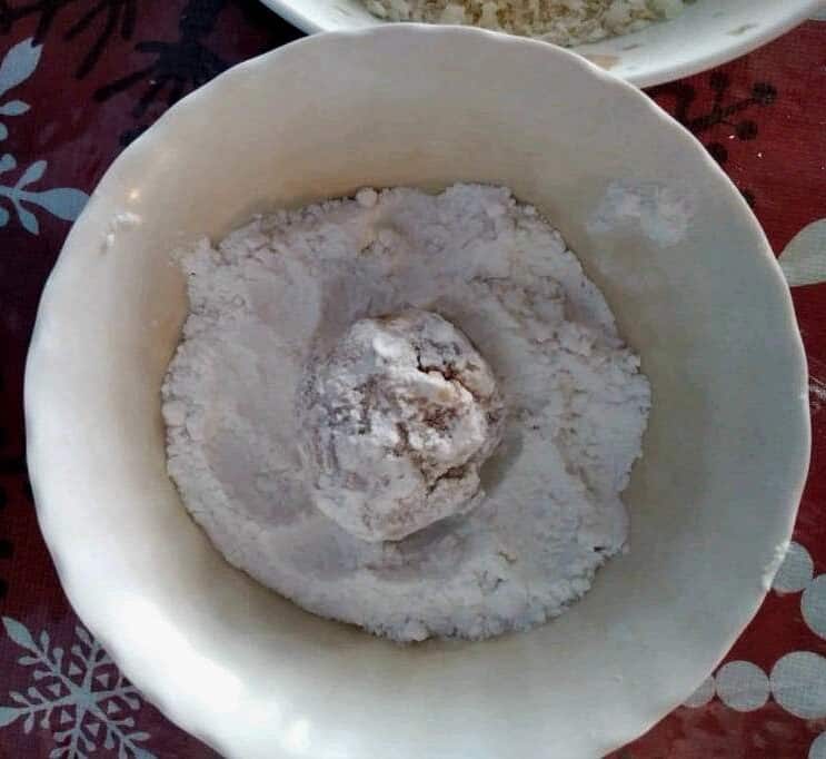 - Coat the shrimp ball into the flour, followed by egg, and then the breadcrumbs.