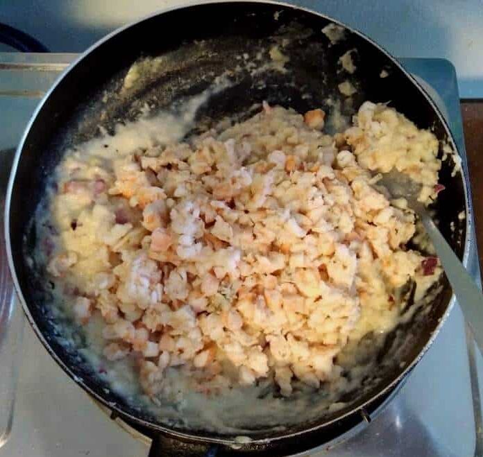 - Add chopped cooked red shrimp. Stir to combine. Add Salt & Black Pepper for taste.
