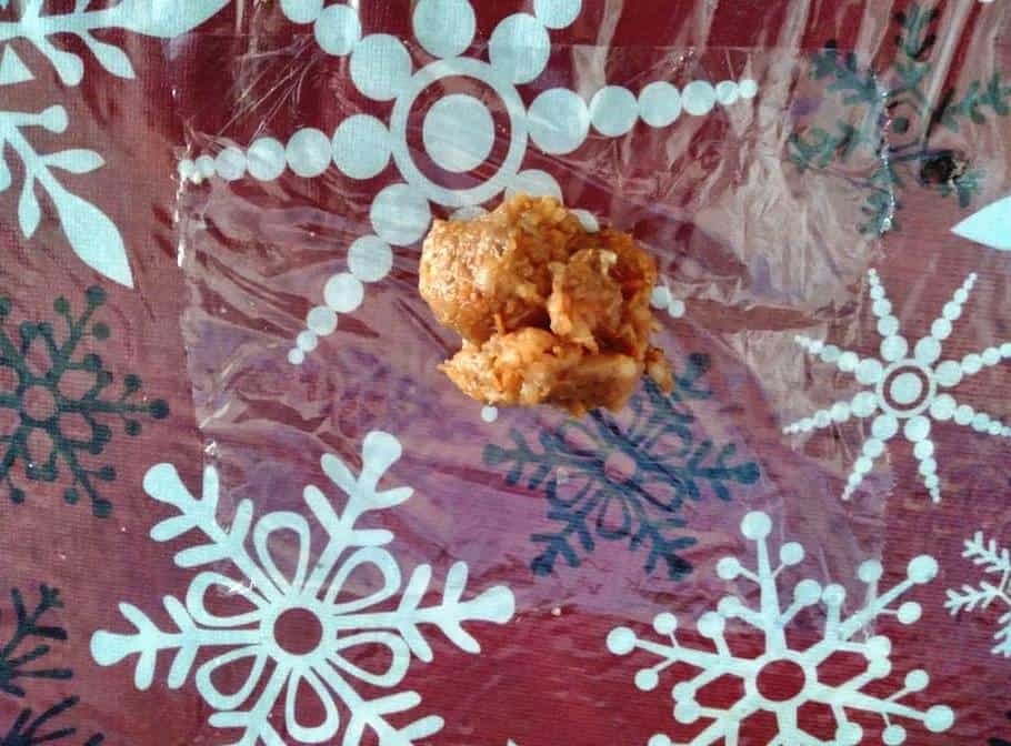 - Take 1 to 1 ½ tablespoons of minced chicken mixture and put it into the center of the plastic wrap or wax paper