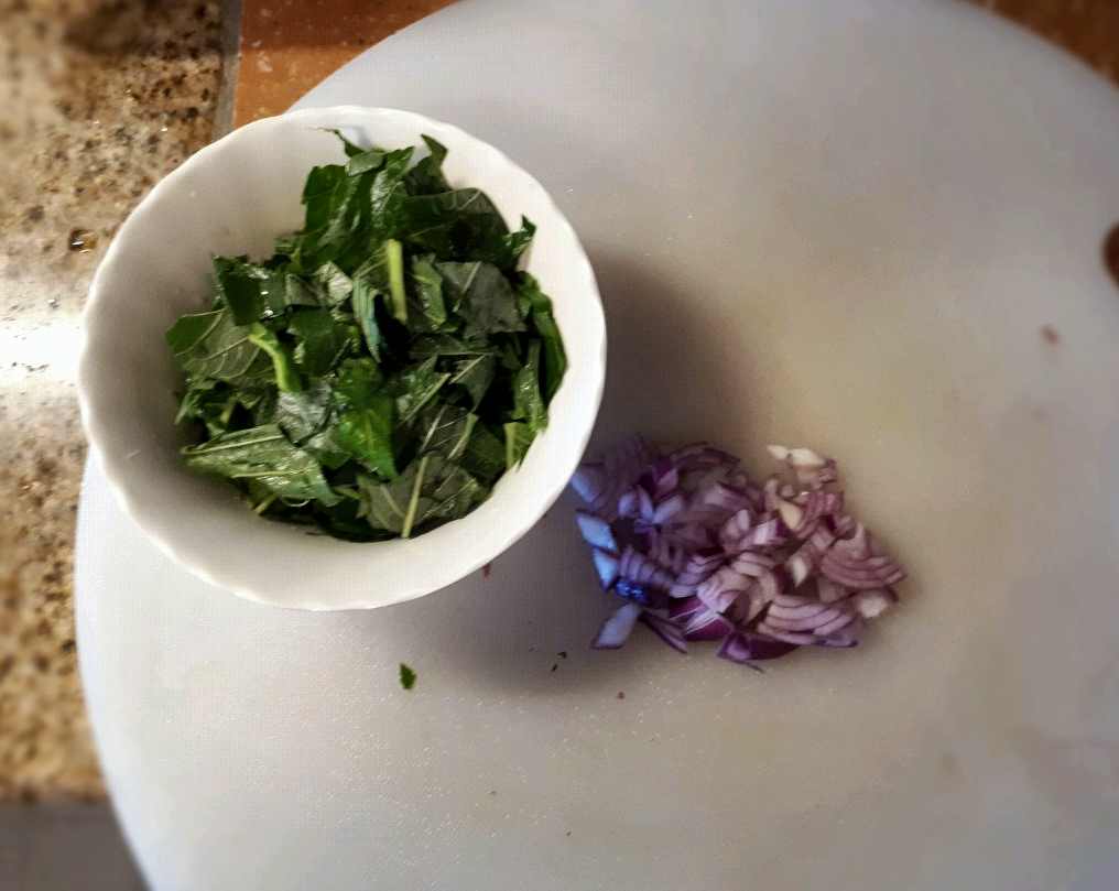 Firstly, you need a fresh spinach which you will be frying it before mixing with the egg. Secondly, you need vegetable oil and onion when frying in the pan. I am using extra virgin olive oil or any olive oil since it is much healthier and gives good flavor when cooking and mixing the spinach.