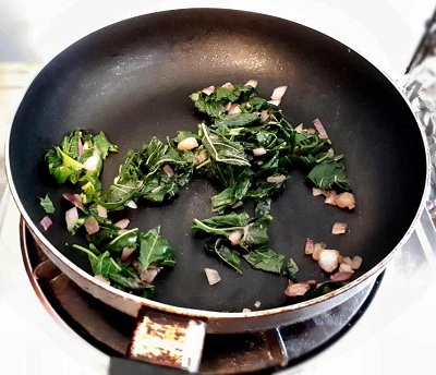 - Once it is hot, add the onion. Stir it for few minutes or until it become light brown. Add the spinach and stir it again