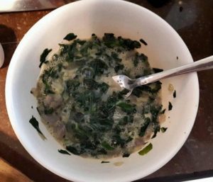 - Remove the cooked spinach from the pan, and put in the bowl. Add the beating egg, salt and black pepper in the bowl and mix it with the spinach.