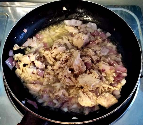 - Once the onion is cooked, add the canned tuna (without the water/oil). Stir occasionally for 2 to 3 minutes