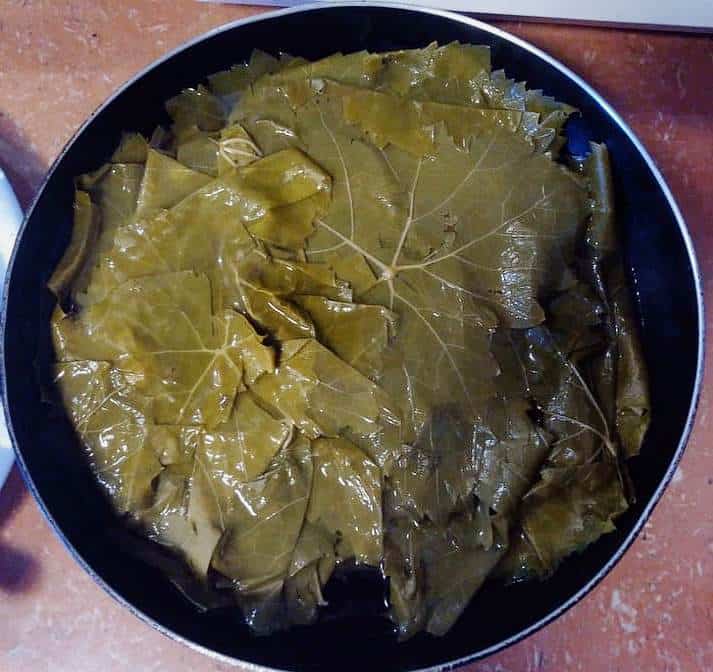 - Add a heat-proof plate to the cooking pot. This will help hold the stuffed grape leaves together during cooking