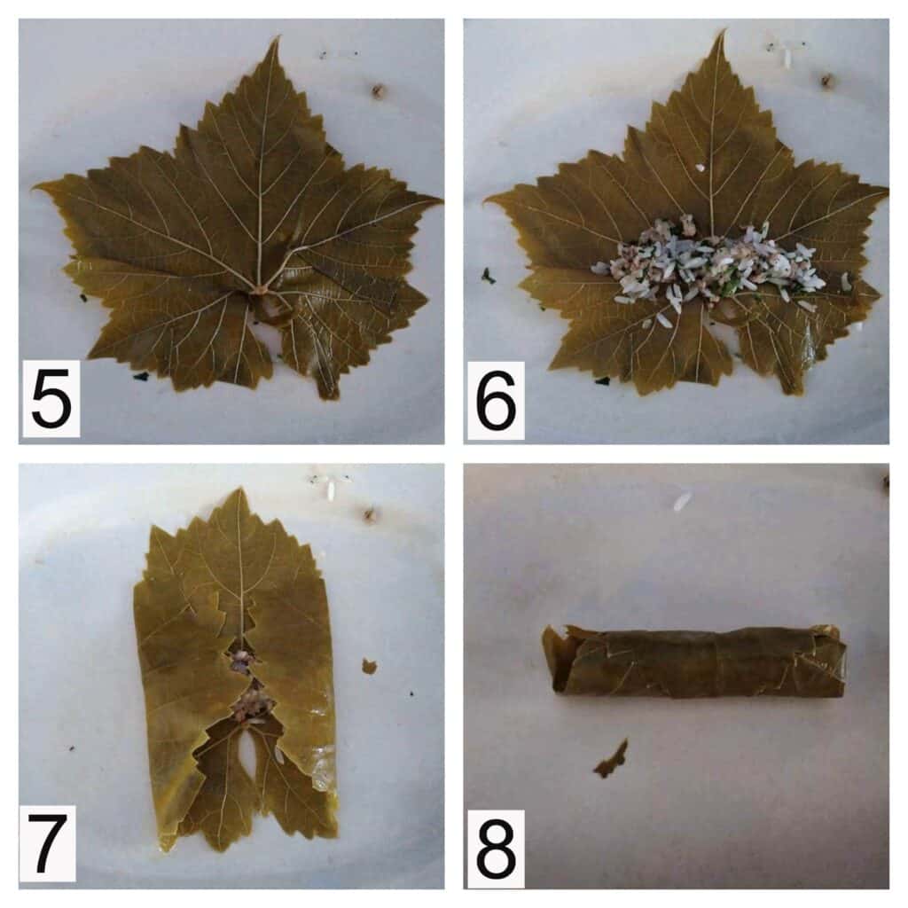 - Fold them on both sides and roll from bottom to top. The grape leaves must be wrapped and rolled tight enough to make sure the rice filling will not go out when simmering.